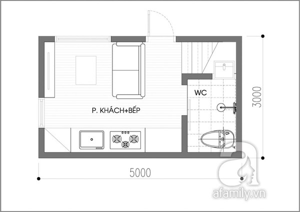 Từ lối đi vào, bên trái sẽ là khu vực cầu thang và nhà vệ sinh. Bạn nên sử dụng hình thức thang cuốn sắt mặt bậc gỗ và lan can kính để tăng giá trị về mặt thẩm mỹ và tiết kiệm diện tích cho căn nhà nhỏ. Một chiếc chậu rửa nhỏ xinh sẽ được bố trí khéo léo dưới gầm thang. Ghế sofa được kê sát cửa sổ lớn nhìn ra khu vườn xanh mát. Đối diện sẽ là hệ thống tủ bếp kết hợp tủ đa năng có khả năng lưu trữ lớn.