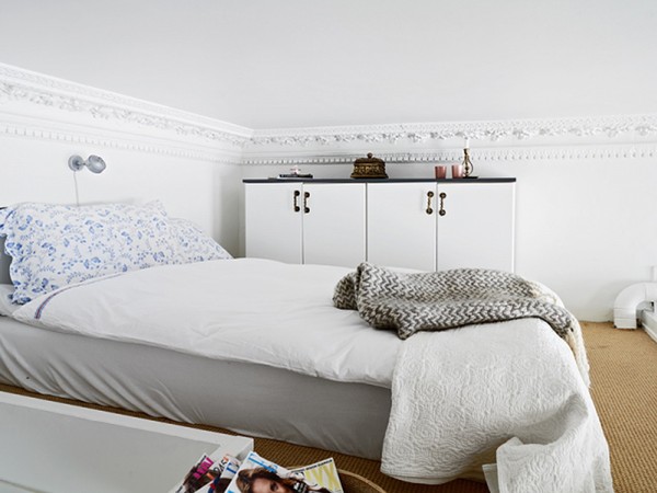 Phòng ngủ trên tầng lửng với trần thấp nhưng không gian thoáng.