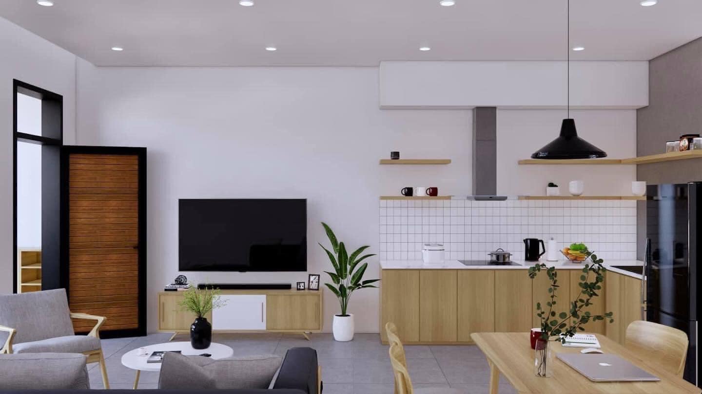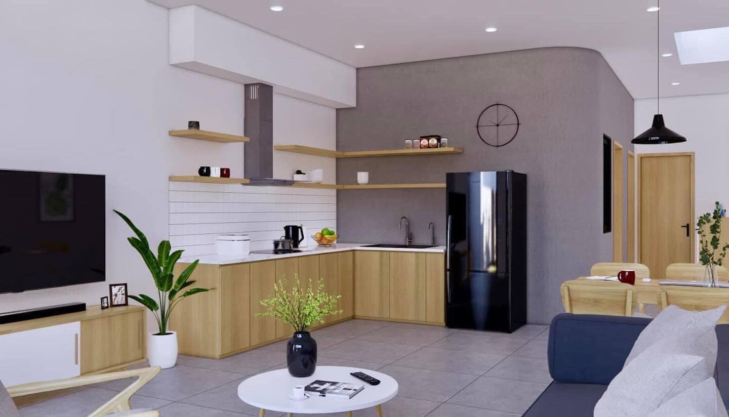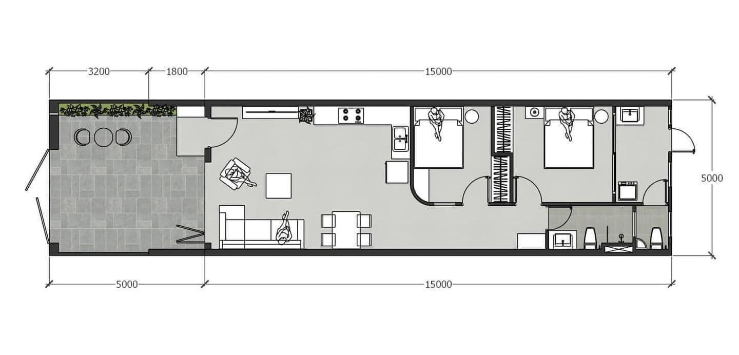 Công ty xây dựng Nguyên giới thiệu Mẫu nhà cấp 4 diện tích 5x15m 2 phòng ngủ hiện đại, được thiết kế trên khuôn viên đất 5x20m, với diện tích xây dựng 5x15m được bố trí công năng 2 phòng ngủ, 1 phòng khách rộng 40m2, bếp được bố trí để tiết kiệm diện tích cho ngôi nhà thiết kế hiện đại.
