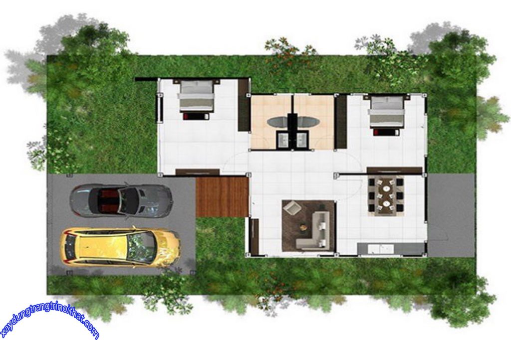 Sơ đồ nhà gồm: 1 gara xe danh cho 2 xe, 2 phòng ngủ, 1 phòng khách, 2 phòng tắm và 1 khu bếp.