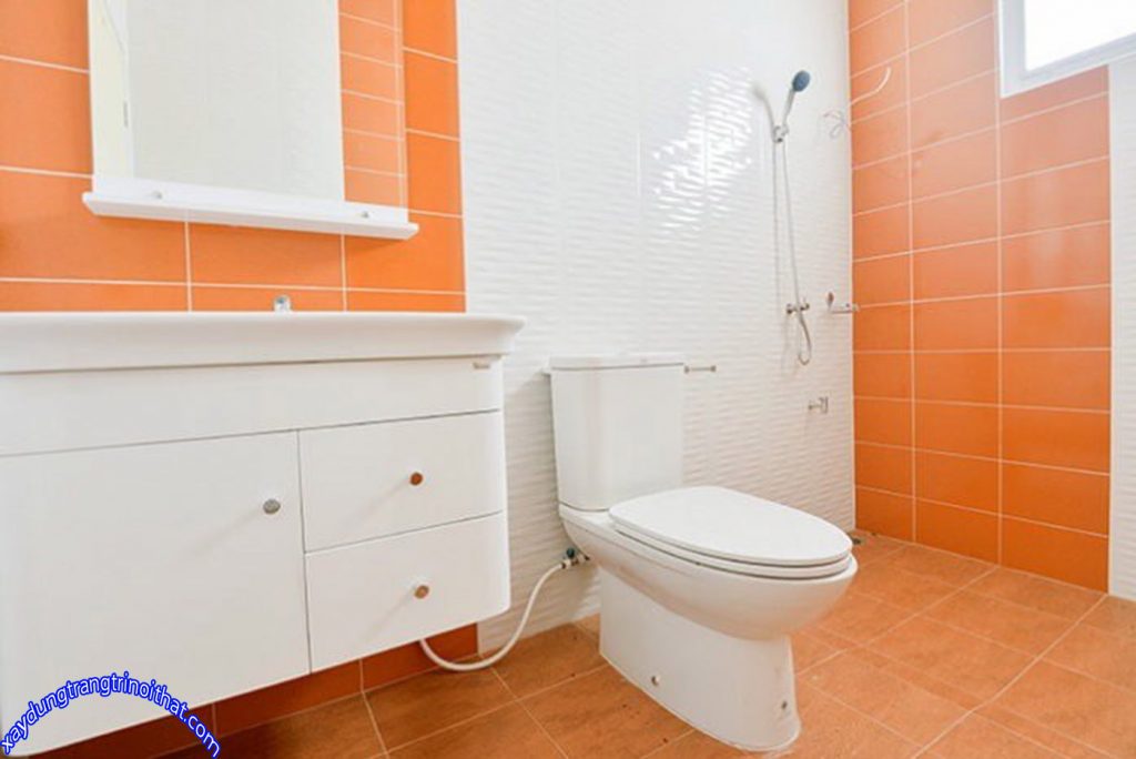 Phòng tắm được ốp gạch màu trắng và màu cam nổi bật.Phòng tắm đầy đủ tiện nghi.
