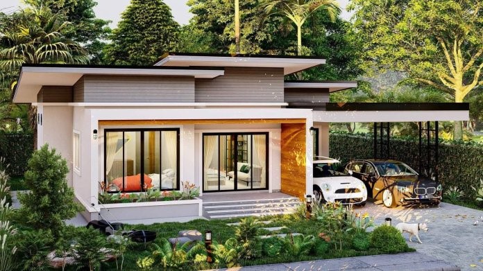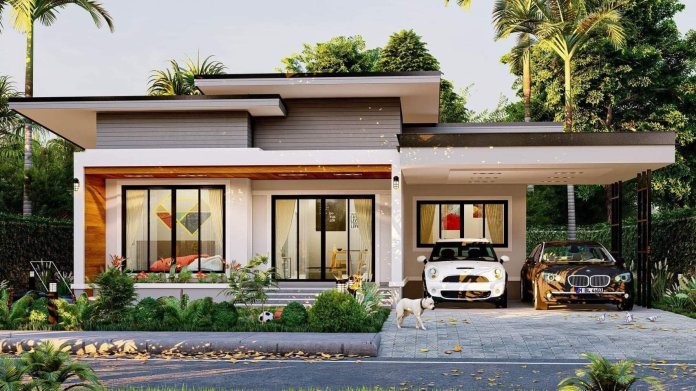 nhà một tầng phong cách hiện đại Kích thước lớn dành cho gia đình đông người chú trọng diện tích sử dụng. Nhà mái thái hướng lên gồm 3 phòng ngủ, 2 nhà vệ sinh, 1 sảnh, 1 nhà vệ sinh, không gian sinh hoạt rộng rãi, kinh phí xây nhà tùy theo vật liệu sử dụng. diện tích xây dựng và các yếu tố khác trong việc xây dựng những ngôi nhà khác nhau.