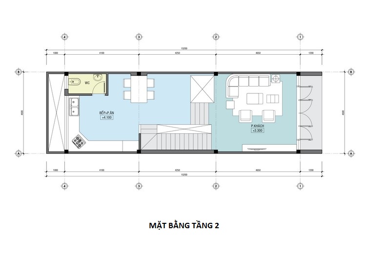 Mặt bằng tầng 2 – Mẫu thiết kế nhà ống 4 tầng 4x15m lệch tầng
