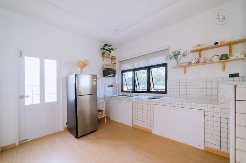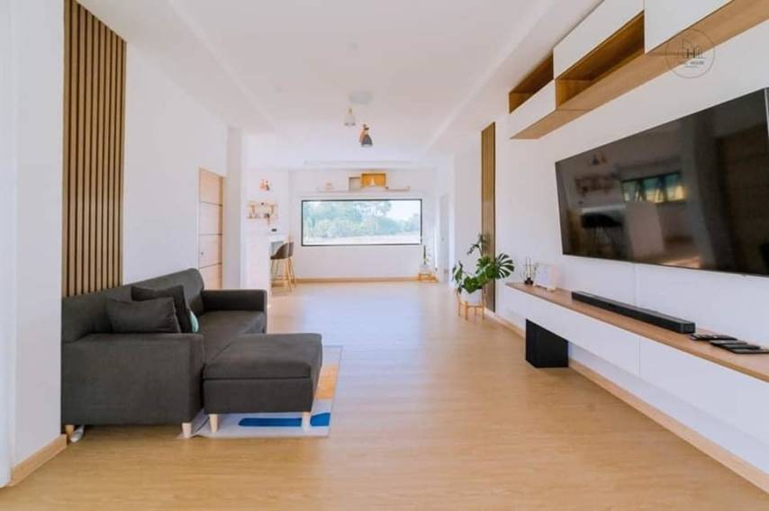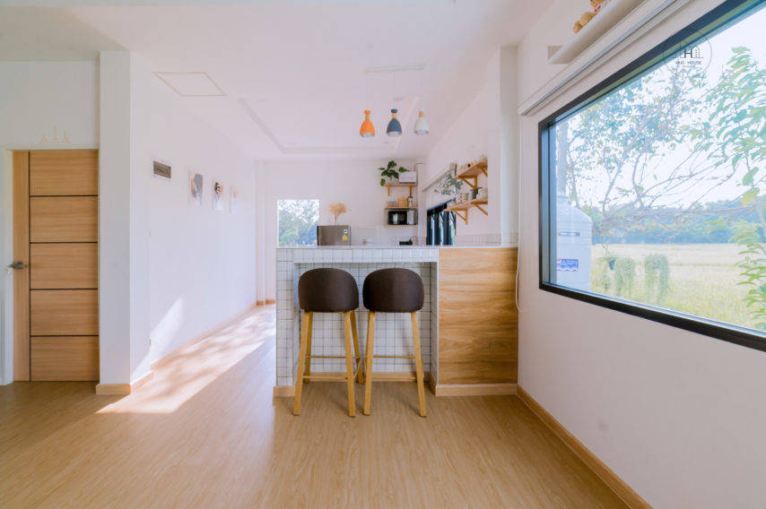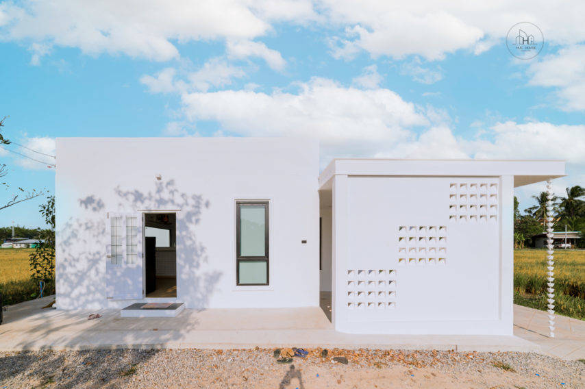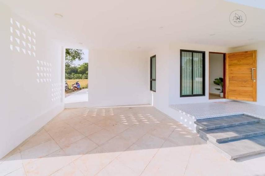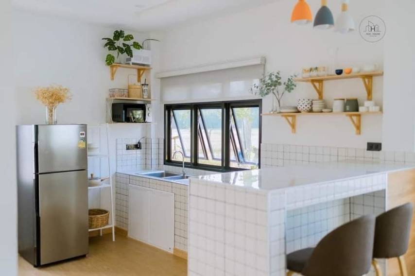để biết chi tiết và chức năng nội bộ Thiết kế nhà hình hộp hiện đại tối giản này Bên trong sảnh trung tâm tiếp khách lớn và rộng rãi. Sàn phòng bằng gạch hoa văn gỗ. Những bức tường tone trắng cũng vậy. Trang trí theo phong cách tối giản, đơn giản và đẹp mắt. Một hành lang mở kết nối với khu vực nhà bếp với quầy bar. Đó là một nhà bếp với mặt bàn bằng xi măng được lát bằng gạch trắng. Phần phòng tắm cũng được trang trí bằng gạch trên toàn bộ bức tường. Thiết kế của ngôi nhà cấp 4 nông thôn này bao gồm 3 phòng ngủ, 2 phòng tắm, 1 nhà bếp và phòng khách. với một nhà để xe Diện tích sử dụng