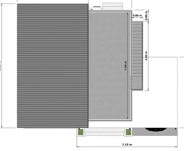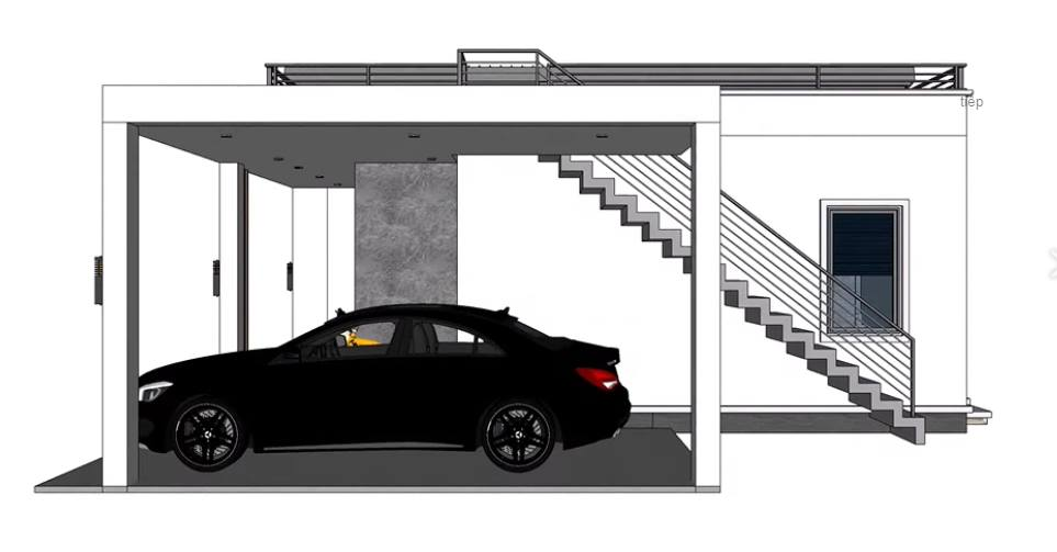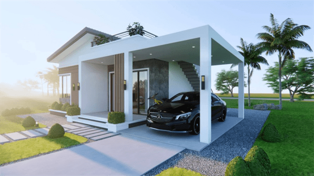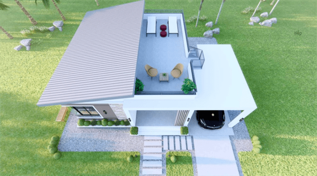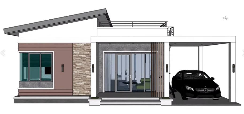 Ngôi nhà cấp 4 sân vường được xây trên diện tích 10x10m, bao gồm 1 gara để xe hơi. Tầng mái được bố trí 1/3 mái và 1/3 được bố trí sân thượng, 1/3 mái che gara cho gia đình.