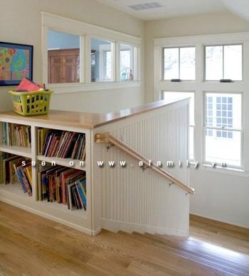 Bức tường ở đầu cầu thang có thể được tận dụng để làm giá đựng tuyệt vời. Tại đây, bạn có thể đặt những đồ vật dùng chung cho các thành viên trong gia đình. Hoặc bạn cũng có thể dùng nó để đựng sách. Nói chung, khu vực này có thể dùng để lưu trữ khá tiện lợi.