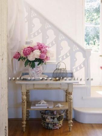 Đặt chiếc bàn nhỏ ở chân cầu thang để đựng đồ vật linh tinh