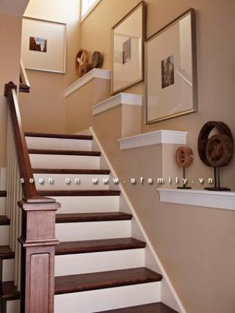 Trưng bày ảnh và lắp giá đựng ở mảng tường bên cạnh cầu thang