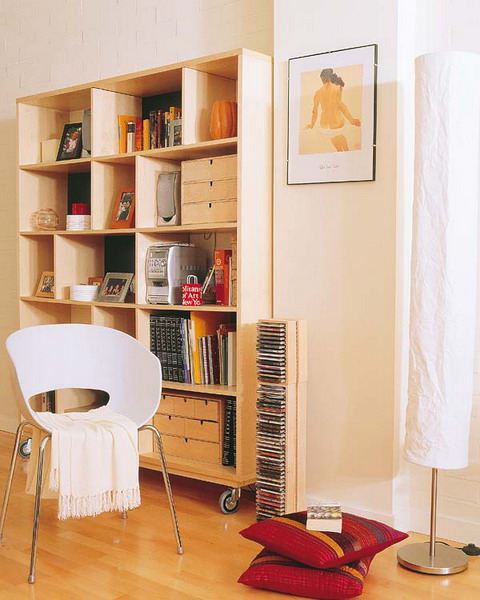 Hệ thống kệ tiện dụng được đặt theo tường nhằm tiết kiệm diện tích. Bên phải còn đặt chiếc đèn thuận tiện cho việc đọc sách thư giản. Kết hợp với một chiếc ghế bàn kiểu dáng cách điệu hiện đại, nó biến thành góc giải trí, thư giãn nhẹ nhàng cho gia đình.