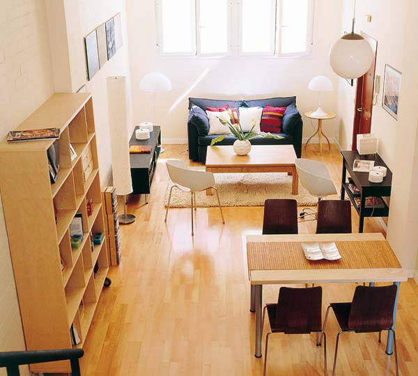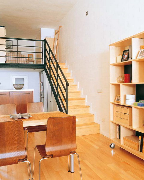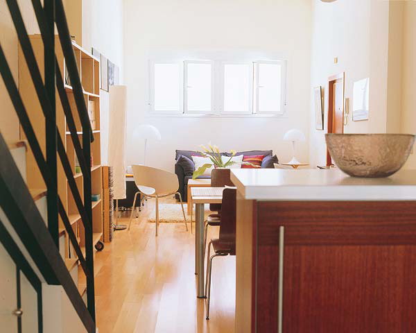 Căn hộ hẹp dài, có hình dáng góc cạnh được thiết kế bao gồm: phòng khách, phòng ăn, bếp, 1 phòng tắm ở tầng trệt và một phòng ngủ ở gác lửng. Nhờ mở rộng diện tích gác lửng dành cho phòng ngủ kín đáo nên các không gian chức năng cũng được bài trí rộng rãi hơn. Điều chú trọng duy nhất là hình dáng hẹp dài của căn hộ đòi hỏi phải có cách thức sắp xếp, bố trí hợp lý, khoa học để không làm mất đi sự tiện nghi, thoải mái.
