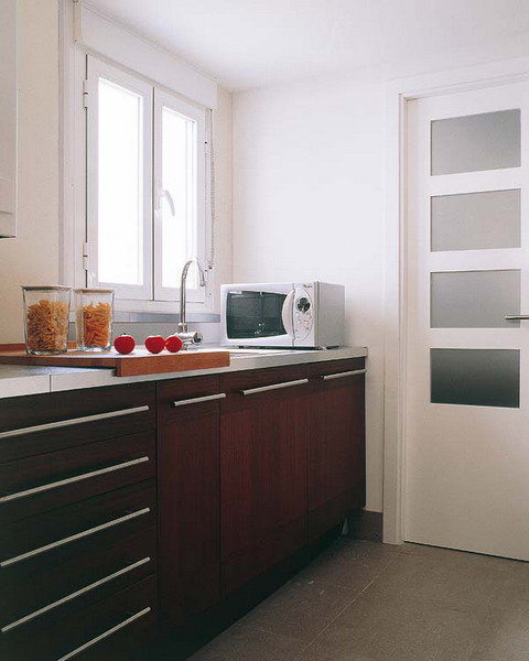 Nhà bếp bài trí không quá cầu kỳ nhưng tiện dụng. Tủ bếp song song, Với hai sắc trắng và gỗ sậm, phòng bếp mang vẻ thanh lịch, cổ điển rất dễ chịu cho thị giác.