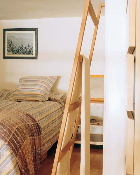Nhà thiết kế sử dụng các bức tường cao và xây dựng thêm một căn gác nhỏ, chứa cả một chiếc giường và tủ quần áo tiện lợi. Phòng ngủ cũng gam màu nhẹ nhàng trên nội thất và chất liệu. Bộ chăn ga đơn giản với họa tiết kẻ sọc. Một bức tranh trên tường tạo điểm nhấn bắt mắt. Nội thất giản đơn được giữ nguyên màu gỗ tự nhiên. Tất cả khiến cho không gian riêng tư toát lên phong thái nhẹ nhàng, gần gũi và rất thư giãn.